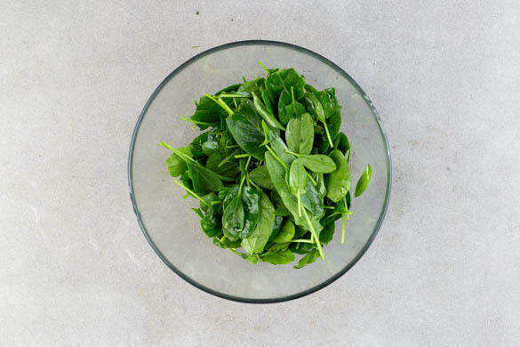 Den Knoblauch in der Pfanne mit 1EL Olivenöl bei mittlerer Hitze ca. 30Sek. anrösten. Die getrockneten Tomaten dazugeben und 1–2Min. mitbraten, bis der Knoblauch weich ist. Dann die ½ des Spinats portionsweise in die Pfanne geben und unter Rühren zusammenfallen lassen. Mit Salz und Pfeffer würzen.