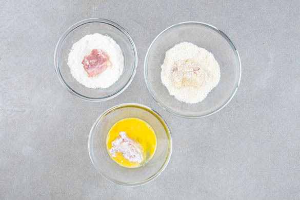 Auf einem tiefen Teller 4EL Mehl bereitstellen. Auf einem zweiten Teller 1 Ei mit 3EL Wasser verquirlen. Auf einem dritten Teller die Semmelbrösel mit den Kokosraspeln mischen. Das Fleisch der Reihe nach im Mehl, im Ei und zum Schluss in der Bröselmischung wenden. Diese etwas festdrücken.