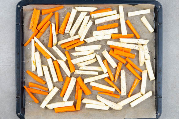 Die Karotten und den Sellerie auf ein oder zwei mit Backpapier ausgelegten Backblechen mit 4EL Olivenöl sowie je 1 kräftigen Prise Salz und Pfeffer vermengen, gleichmäßig verteilen und 20–25Min. im Ofen rösten, bis das Gemüse an den Rändern bräunt. Nach der Hälfte der Zeit einmal wenden.