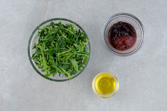 Den Rucola ggf. verlesen. 2EL Olivenöl mit 2TL Essig sowie je 1 kräftigen Prise Salz und Pfeffer zu einem Dressing verrühren und kurz vor dem Servieren mit dem Rucola vermengen. Für den Dip die Hoisinsauce mit 4EL Ketchup verrühren.