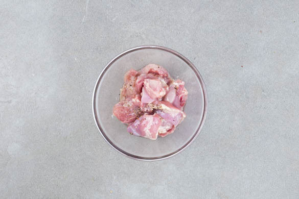 Den Backofen auf 240°C (220°C Umluft) vorheizen. Das Fleisch trocken tupfen und in 1–2cm dünne Stücke schneiden, dann mit 1EL Essig sowie je 1 Prise Salz und Pfeffer vermengen und beiseitestellen.