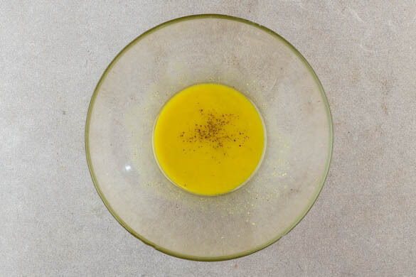 4EL Olivenöl mit 2EL Essig, ½TL Senf, ½TL Honig und je ½TL Salz und Pfeffer zu einem Dressing verrühren.