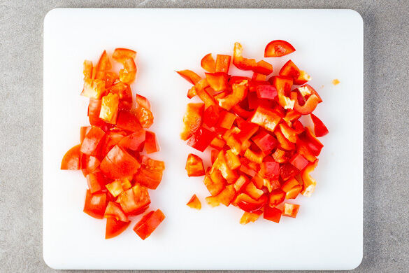 Inzwischen die Tomaten in ca. 1cm große Würfel schneiden. Die Paprika vierteln, entkernen und in ca. 1cm große Stücke schneiden.