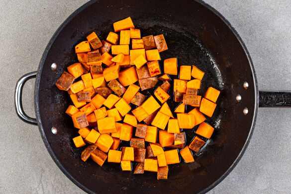 Nach ca. 10Min. Garzeit die Zwiebeln und 1EL Butter zu den Süßkartoffeln geben und 2–3Min. mitbraten.