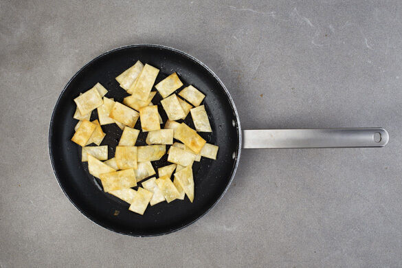 Die Pfanne ca. 0,5cm hoch mit Olivenöl befüllen und das Öl mittelhoch erhitzen. Die Tortillastücke ggf. in mehreren Portionen in 1–2Min. goldbraun ausbacken. Nach Bedarf die Hitze reduzieren, falls die Tortillas zu schnell dunkel werden. Auf etwas Küchenkrepp abtropfen lassen, dann mit je 1 Prise Chiliflocken und Salz vermengen.