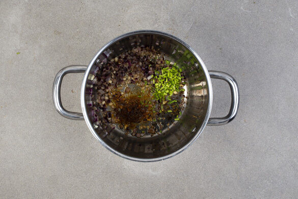 Die Zwiebeln und den Knoblauch in einem mittelgroßen Topf mit 1EL Olivenöl bei mittlerer Hitze 2–3Min. anschwitzen. Inzwischen die geröstete Paprika grob würfeln. Die Korianderstängel und nach Geschmack ½–1TL Chiliflocken in den Topf geben, unterrühren und ca. 1Min. mitbraten. Vorsicht, die Chiliflocken sind sehr scharf!