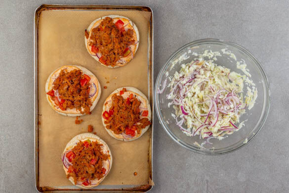 Die Pitabrote auf einem mit Backpapier ausgelegten Backblech verteilen, ggf. ein zweites Blech verwenden. Die Pitas mit der Crème fraîche bestreichen und mit der ½ der Zwiebeln, den Tomaten und dem Pulled Chicken belegen.
