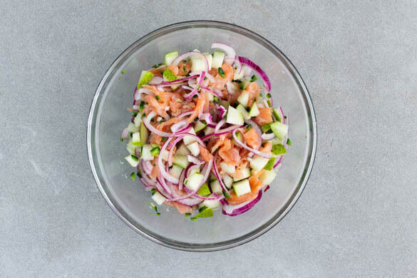 Die Chilischote halbieren und fein würfeln, dabei die Kerne entfernen. Die Birnen vierteln und in ca. 1cm große Würfel schneiden, dabei das Kerngehäuse entfernen. Die Zwiebeln in ein Sieb abgießen. Die Limetten halbieren und auspressen, den Limettensaft mit dem Räucherlachs, den Birnen, den Zwiebeln, der Chilischote und 1TL Salz vermengen.