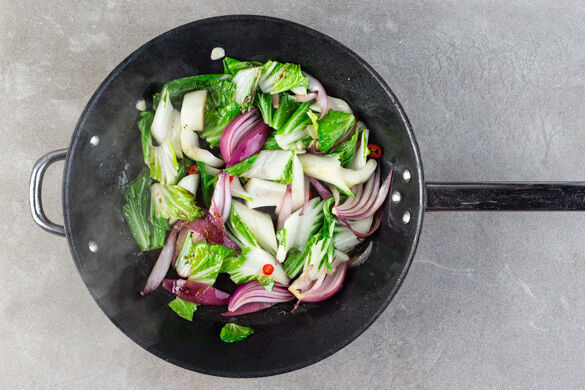 Kurz bevor das Fleisch und der Reis fertig sind, den Pak Choi und die Zwiebelspalten in einer großen Pfanne mit 2EL Olivenöl bei starker Hitze 3–4Min. scharf anbraten. Den Knoblauch zugeben, mit 50ml Wasser ablöschen und 1–2Min. köcheln lassen. Mit dem restlichen 5-Gewürze-Pulver, den Chiliringen, dem Zitronensaft und Salz abschmecken.