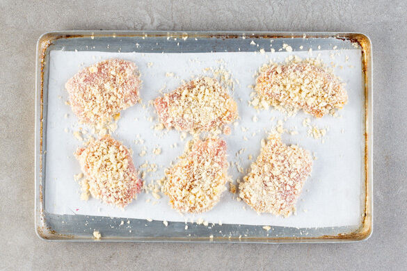 Die Fleisch trocken tupfen und halbieren. Mit 2EL Olivenöl, 2TL 5-Gewürze-Pulver und 1 Prise Salz einreiben und anschließend im Panko-Paniermehl wälzen. Auf ein mit Backpapier ausgelegtes Backblech geben, mit insgesamt 2EL Olivenöl beträufeln und ca. 20Min. im Ofen knusprig backen.