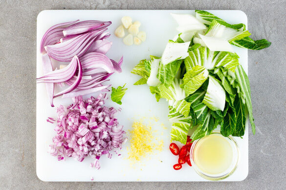 Die Zwiebel schälen und halbieren, eine Hälfte fein würfeln, die andere Hälfte längs in Spalten schneiden. Den Knoblauch schälen und in feine Scheibchen schneiden. Den Pak Choi schräg in ca. 3cm breite Streifen schneiden. Die Chili in dünne Ringe schneiden und ggf. entkernen. Die Zitronenschale fein abreiben, dann die Zitrone halbieren und auspressen.