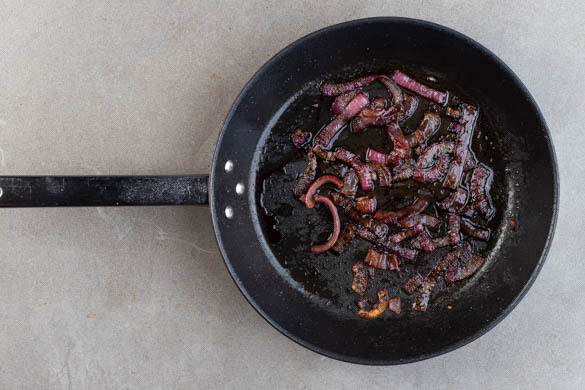 Die Zwiebeln in einer kleinen Pfanne mit 1EL Olivenöl und 1 kräftigen Prise Salz bei mittlerer Hitze in ca. 10Min. weich braten. Ggf. mit 1EL Wasser vom Pfannenboden lösen. Mit 1EL Balsamicoessig ablöschen und 2–5Min. einköcheln lassen.