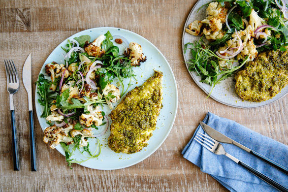 Pistazien haben nicht nur eine schöne grüne Farbe, sondern auch ein ganz besonders feines Aroma. Grund genug, sie heute in einem leckeren, knusprigen Belag für dein Hähnchenfilet zu verarbeiten. Und wenn du dazu noch einen raffinierten Salat mit im Ofen gebackenen Blumenkohl servierst, hast du im Nu eine super Low-Carb-Mahlzeit auf dem Tisch!