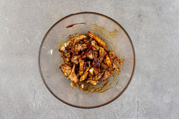Das Fleisch mit zwei Gabeln zerzupfen und mit der Hoisinsauce vermengen.