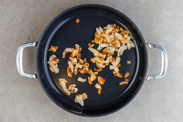 Den Backofen mit Grillfunktion oder Ober-/Unterhitze auf 250°C vorheizen. In einem mittelgroßen Topf ausreichend gesalzenes Wasser für die Pasta zum Kochen bringen. Die Kokosraspel in einer mittelgroßen, tiefen Pfanne ohne Zugabe von Fett bei mittlerer Hitze in 2–3Min. goldbraun anrösten. Sofort aus der Pfanne nehmen und beiseitestellen. Die Pfanne wird weiterverwendet.