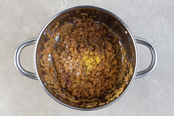 Die Zwiebelwürfel in einem kleinen Topf mit 1EL Butter bei mittlerer Hitze in 2–4Min. glasig anschwitzen. Den Reis unterrühren, dann mit der Brühe ablöschen und einmal aufkochen lassen. Abgedeckt ca. 20Min. im Ofen garen.