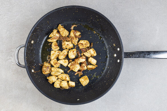 Die Fleisch-Zwiebel-Mischung in einer großen Pfanne mit 1EL Olivenöl bei mittlerer Hitze 4–6Min. anbraten, bis das Fleisch durch ist und die Zwiebeln weich sind. Die Pfanne vom Herd nehmen.
