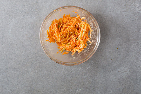 Die Karotten mit der ½ der Lauchzwiebeln und 2EL Mayonnaise vermengen und den Salat mit je 1 kräftigen Prise Salz und Pfeffer würzen.