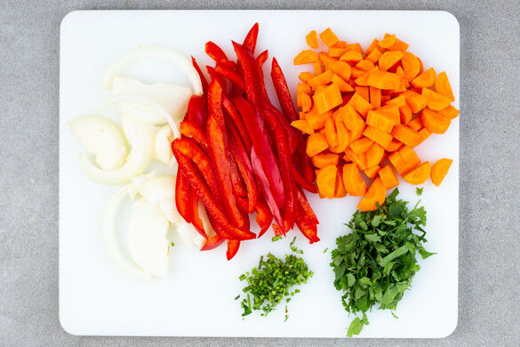 Die Karotte ggf. schälen, längs und in breite Scheiben schneiden. Die Paprika vierteln, entkernen und in dünne Streifen schneiden. Die Zwiebel schälen, halbieren und in breite Streifen schneiden. Die Korianderblätter abzufen, die Korianderstiele fein schneiden.