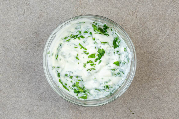 Währenddessen die Petersilie samt Stängeln fein hacken. Den Joghurt mit der Petersilie verrühren und mit Salz und Pfeffer abschmecken.