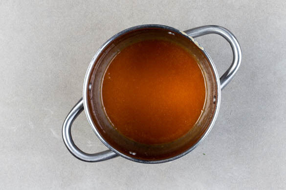 Den Topf vom Herd nehmen, sobald der Karamell goldbraun wird. Mit der Sahne ablöschen und vorsichtig verrühren. Den erhärteten Karamell bei mittlerer Hitze erwärmen, bis er flüssig wird und Blasen schlägt, dann wieder vom Herd nehmen und 80g Butter einrühren. Zum Auskühlen beiseitestellen.