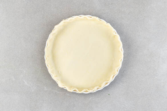 Mit einer Gabel Löcher in den Boden und die Seiten des Teiges stechen. Das Backpapier über den Teig legen. Ggf. mehr Backpapier verwenden, sodass der gesamte Teig bedeckt ist. Die Quicheform mit dem Backgewicht befüllen. Tipp: Die Ränder mit dem Backgewicht stabilisieren, damit sie beim Backen nicht zusammenfallen.