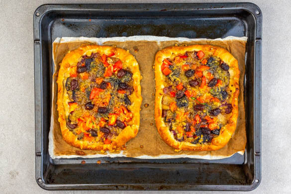 Die Pide 15–20Min. im Ofen backen, bis der Teig an den Rändern knusprig und goldbraun ist. Je nach Ofen die Position der Bleche nach der Hälfte der Zeit tauschen.