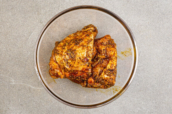 Das Fleisch auf einem mit Backpapier ausgelegten Backblech verteilen. Übriges Würzöl aufbewahren. Das Fleisch in den noch vorheizenden Ofen schieben und 10–15Min. backen, bis die Haut zu bräunen beginnt.
