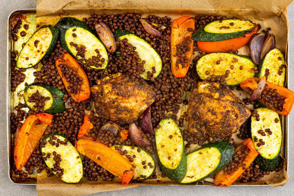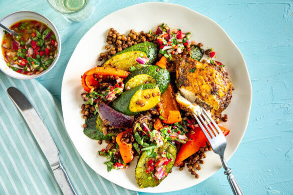 Unser Hähnchen bekommt heute eine ordentliche Abreibung – aber im guten Sinne! In der karibischen Küche bedeutet „Jerk-Style“ nämlich, sein Grillgut mit einer ellenlangen Liste von Gewürzen einzureiben, bevor es gebraten wird. Auch Zucchini, Paprika und Linsen bekommen eine gute Portion Geschmack mit auf den Weg in den Backofen. Serviert wird das Ganze mit einem frischen Orangen-Koriander-Dressing. Top!