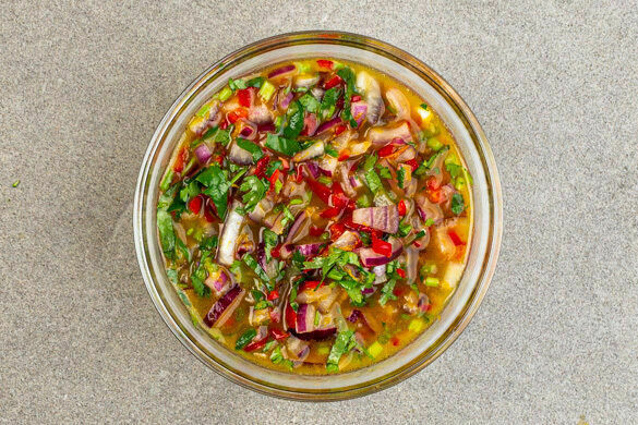 Das Fleisch mit dem Linsen-Gemüse auf Teller verteilen und mit dem Dressing beträufeln. Mit dem restlichen Koriander garnieren und servieren.