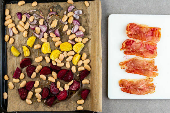 Die ½ des Schinkens auf das Gemüse legen und alles im Ofen 6–7Min. backen, bis der Schinken goldbraun und knusprig ist. Den Schinken herausnehmen und abkühlen lassen. Mit dem übrigen Schinken ebenso verfahren. Dann die Bohnen mit den Beten und den Zwiebeln vermengen und weitere 10–14Min. backen, bis die Beten gar sind.