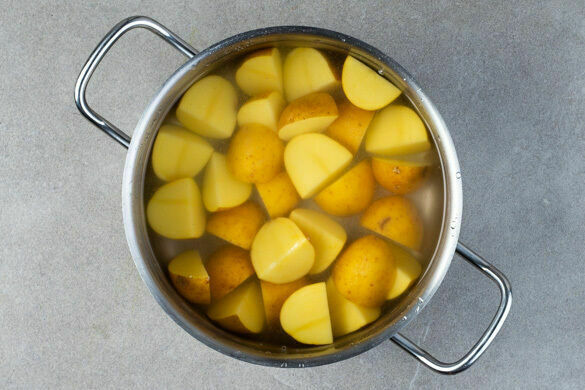 Den Backofen auf 180°C (160°C Umluft) vorheizen. In einem mittelgroßen Topf ausreichend gesalzenes Wasser für die Kartoffeln zum Kochen bringen. Die Kartoffeln samt Schale je nach Größe halbieren oder vierteln, in das kochende Wasser geben und 15–20Min. kochen lassen, bis die Kartoffeln gar sind. In ein Sieb abgießen und abkühlen lassen.