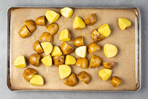 Den Backofen auf 240°C (220°C Umluft) vorheizen. Die Kartoffeln samt Schale vierteln und auf ein mit Backpapier ausgelegtes Backblech geben. Mit 1EL Olivenöl, 1/2TL Salz und 1 Prise Pfeffer vermengen und ca. 25 Min. im Ofen rösten.