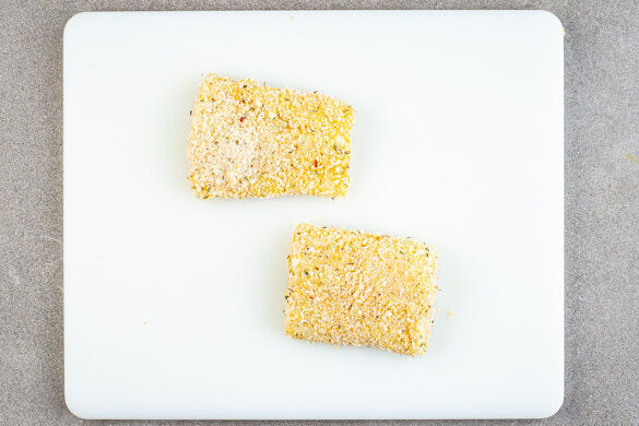 Den Fisch kalt abspülen, trocken tupfen und evtl. vorhandene Gräten entfernen. 2EL Mehl mit je 1 kräftigen Prise Salz und Pfeffer auf einem tiefen Teller vermengen. 1 Ei mit 1 Prise Salz auf einem zweiten Teller verquirlen. Die ½ des Panko-Paniermehlsauf einem dritten Teller mit der Gewürzmischung mischen. Den Fisch erst im Mehl, dann im Ei und schließlich im Paniermehl wenden.