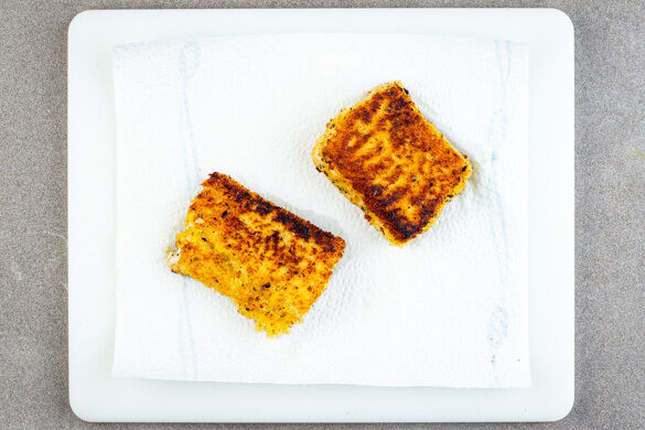 Eine mittelgroße Pfanne ca. 1cm hoch mit Pflanzenöl füllen und mittelhoch erhitzen. Tipp: Das Öl ist heiß genug, sobald sich kleine Bläschen bilden, wenn man einen Holzlöffel hineinhält. Den Fisch ins heiße Öl geben und auf jeder Seite 3–4Min. braten, bis er goldbraun ist. Mit je 1 Prise Salz und Pfeffer würzen und auf etwas Küchenkrepp abtropfen lassen.