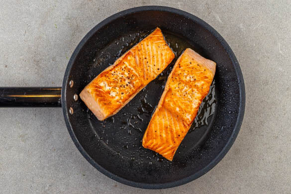 Den Fisch mit der Hautseite nach unten in einer zweiten mittelgroßen Pfanne mit 2TL Olivenöl bei mittlerer Hitze 3–5Min. braten. Mit je 1 Prise Salz und Pfeffer würzen, dann vorsichtig wenden und 1–2Min. weiterbraten. Den Fisch aus der Pfanne nehmen, dann die restlichen Schalotten mit ½EL Butter bei mittlerer Hitze ca. 2Min. braten. ½EL Mehl unterrühren und ca. 1Min. mitbraten.
