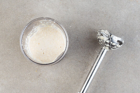 Die Mandelblättchen mit 1½TL Zucker, 50ml Wasser und 1 Prise Salz in einem hohen Gefäß mit einem Stabmixer fein pürieren.
