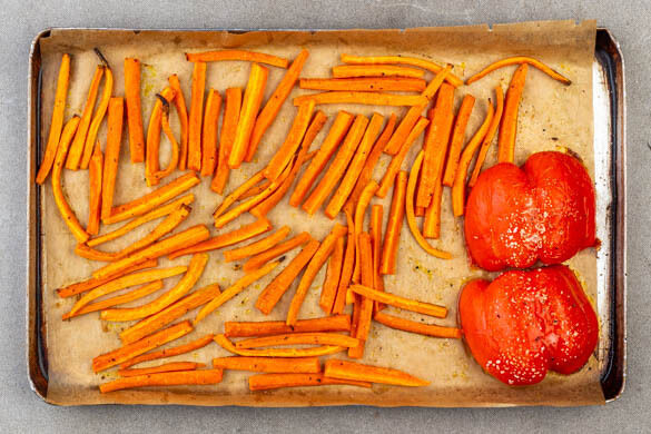 Das Backblech aus dem Ofen nehmen und die Karotten und die Paprika mit der ½ der Gewürzmischung vermengen.