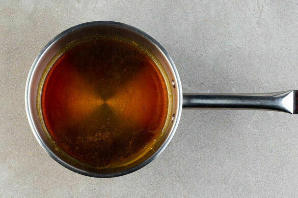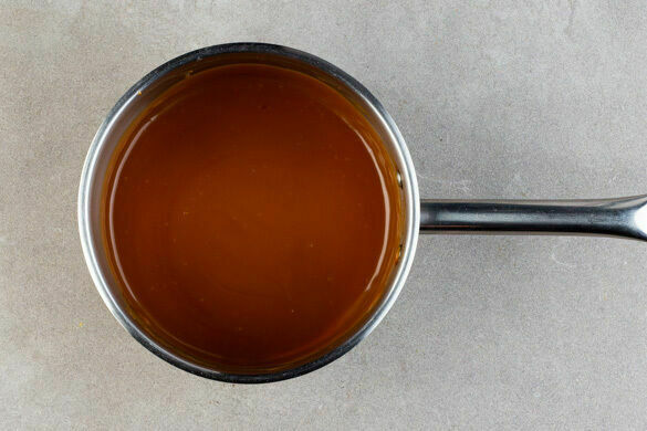 Einen mittelgroßen Topf mittel bis stark erhitzen. Den restlichen Zucker und 80ml Wasser in den Topf geben und ohne Rühren aufkochen lassen, den Topf ggf. leicht hin und her schwenken. Vorsicht, der Zucker wird sehr heiß! Sobald sich der Zucker aufgelöst hat und anfängt, goldbraun zu werden, sofort den Topf vom Herd nehmen.