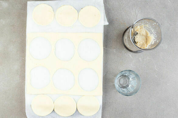 Den Teig samt Papier auf einem Backblech ausrollen, mit einem Glas oder einer Plätzchenform 12 Kreise von ca. 8cm Durchmesser ausstechen und die Mandelcreme darauf verstreichen. Jeweils 3 Teigkreise übereinanderstapeln und die 4 Törtchen gleichzeitig mit den Birnen im Ofen in 15–17Min. knusprig backen, dabei darauf achten, dass die Mandelcreme nicht verbrennt.
