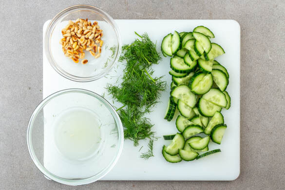 Die Pinienkerne in einer kleinen Pfanne ohne Zugabe von Fett bei mittlerer Hitze 3–4Min. anrösten, bis sie goldbraun sind. Den Dill samt Stängeln grob schneiden. Die Zitrone halbieren und eine Hälfte auspressen, die andere Hälfte für ein anderes Rezept aufbewahren. Die Gurke längs halbieren und in dünne Scheiben schneiden.