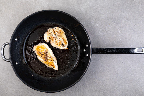 Das Fleisch in einer großen Pfanne mit 1EL Olivenöl bei starker Hitze auf jeder Seite 1–2Min. scharf anbraten. Das Fleisch samt Bratensatz aus der Pfanne nehmen und auf einem Teller ruhen lassen.