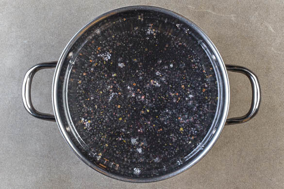 In einem mittelgroßen Topf ausreichend gesalzenes Wasser für die Linsen zum Kochen bringen. Die Linsen in das kochende Wasser geben und in ca. 20Min. bissfest kochen.