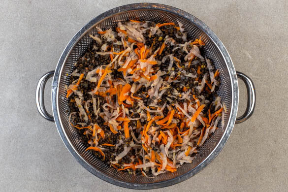 Die Knollensellerie- und die Karottenraspel während der letzten 3Min. zu den Linsen geben und mitköcheln lassen, bis das Gemüse bissfest ist. Anschließend alles in ein Sieb abgießen und abtropfen lassen.