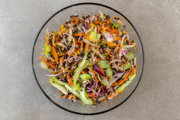 Die Linsen mit dem Stangensellerie und den Zwiebeln vermengen. Die Zitronenschale abreiben und die Zitrone halbieren, eine Hälfte auspressen, die andere Hälfte in Spalten schneiden. Den Linsensalat mit 2EL Olivenöl, Zitronensaft nach Geschmack, 1TL Zitronenschale sowie Salz und Pfeffer abschmecken.