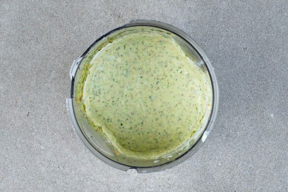 Das Basilikum grob schneiden. Die Zitronenschale abreiben, dann die Zitrone halbieren und auspressen. Die Crème fraîche mit der ½ des Basilikums, 1EL Zitronensaft, 2TL Senf, 1TL Honig und ½TL Salz in einem hohen Gefäß pürieren und ca. ½TL Zitronenschale untermengen.