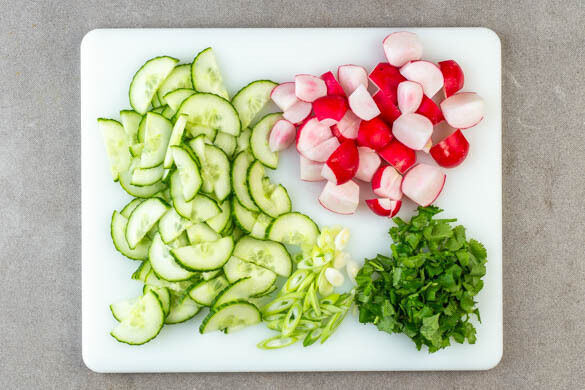 Die Gurke längs halbieren und in dünne Scheiben schneiden. Die Radieschen vierteln. Die Lauchzwiebel in dünne Ringe schneiden. Den Koriander grob schneiden.