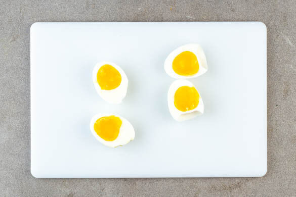 In einem kleinen Topf ausreichend Wasser für die Eier zum Kochen bringen. Die Eier vorsichtig in das kochende Wasser geben und bei mittlerer Hitze in ca. 6Min. weich kochen. Die Eier abgießen, kalt abschrecken und mit etwas kaltem Wasser zurück in den Topf geben.