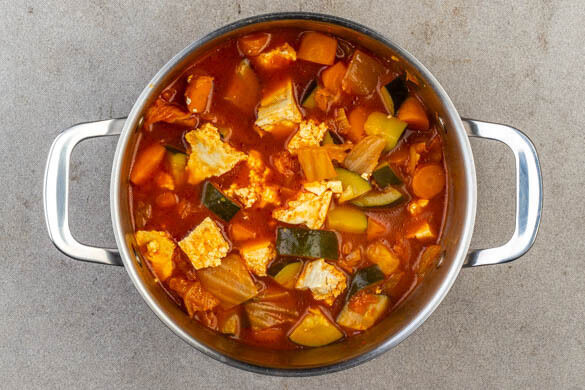 Die Zucchini längs vierteln und in ca. 2cm breite Stücke schneiden. Den Knoblauch schälen und fein würfeln. Die Zucchini, den Knoblauch, das Kimchi und die ½ der Chilipaste in den Topf geben und ca. 5Min. mitbraten, bis die Chilipaste leicht am Topfboden ansetzt.
