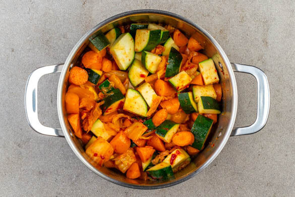 Die Zucchini längs vierteln und in ca. 2cm breite Stücke schneiden. Den Knoblauch schälen und fein würfeln. Die Zucchini, den Knoblauch, das Kimchi und die ½ der Chilipaste in den Topf geben und ca. 5Min. mitbraten, bis die Chilipaste leicht am Topfboden ansetzt.